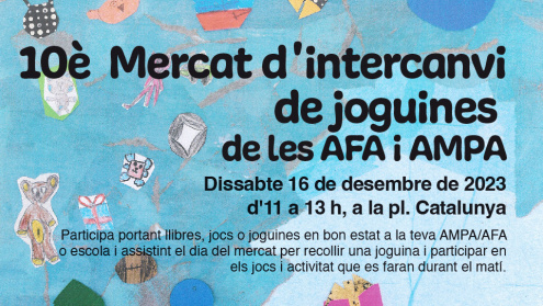El proper 16 de desembre, d’11 a 13h, la Plaça Catalunya acollirà la desena edició del Mercat d’Intercanvi de Joguines. El projecte consisteix en la recollida de joguines de segona mà als centres educatius per tal d’intercanviar-les després en un gran mercat en l’àmbit de tota la ciutat. Et convidem, doncs, a portar llibres, jocs o joguines en bon estat a la teva AMPA o AFA o a la teva escola perquè tinguin una segona vida. A més, recorda que, si en lliures una, el dia del mercat, podràs escollir-ne una altra.