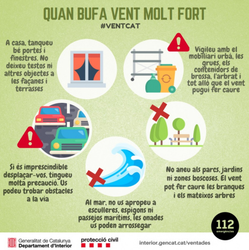 Així mateix, es recomana a la població que segueixi les mesures de prevenció habituals davant d’episodis de ventades, que sobretot són evitar zones amb risc com parcs i fixar bé elements que es puguin desprendre de façanes, balcons o finestres.