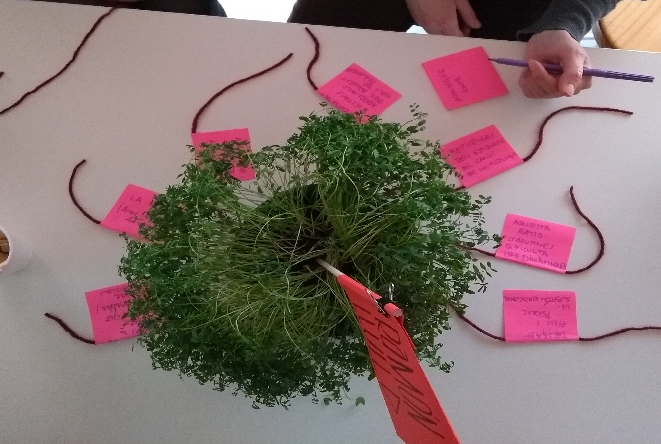 Una vegada es comparteixen els corresponents projectes i les seves potencialitats i dificultats, els i les educadores i mestres sembren llavors en diferents testos que s’intercanvien i, com a petjada d'aquesta acció, hi escriuen els ingredients necessaris perquè una planta surti i perduri.