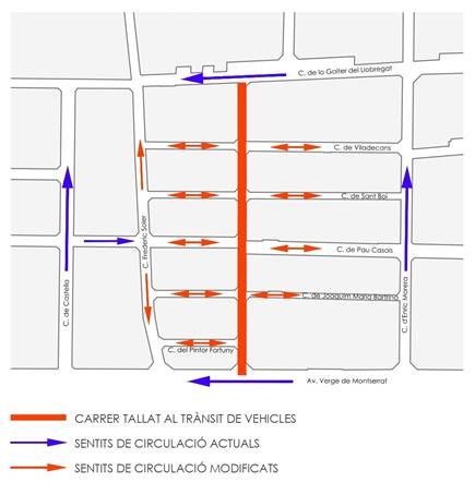 Les obres es realitzaran progressivament, començant per l’Avinguda Verge de Montserrat i en direcció a Lo Gaiter del Llobregat. Quan es realitzin les feines d’un tram concret, no es permetrà el pas de vehicles ni l’accés als guals on així estigui senyalitzat. L’accés als trams del carrers de Viladecans, Sant Boi, Pau Casals i Joaquim Maria Bartrina, entre Enric Morera i Sant Pere, es realitzarà des del carrer d’Enric Morera, amb doble sentit i sortida pel mateix carrer. L’accés als trams del carrers de Viladecans, Sant Boi, Pau Casals, Joaquim Maria Bartrina i Pintor Fortuny, entre Frederic Soler i Sant Pere, es realitzarà des del carrer de Frederic Soler, amb doble sentit i sortida pel mateix carrer.