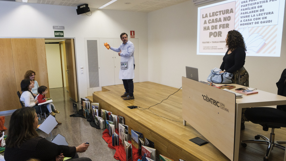 Ens trobem a la sala d'actes del Cèntric Espai Cultural, un dimecres de maig a la tarda, a punt de començar la sessió participativa per famílies que ha organitzat el Lecxit i la Biblioteca Antonio Martín dins del marc d’Interseccions, amb la col·laboració d'El Prat Famílies. En aquesta, hi participa la Cia. T’exto de menos, amb la Maribel Martín i David Font, i també la mediadora literària Mar González, les quals introduiran situacions quotidianes de lectura a casa per tal de compartir alguns consells per gaudir molt més amb la família sobre el plaer de llegir.