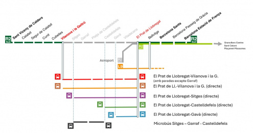 Entre l’1 i el 4 de maig, el servei de Rodalies de Catalunya experimentarà alteracions per les obres del nou accés ferroviari a l’aeroport, així com altres intervencions de millora a la xarxa. Això suposarà un tall en la connexió entre el Prat i l'aeroport i entre el Prat i Vilanova i la Geltrú, afectant les estacions de Viladecans, Gavà, Castelldefels, Castelldefels-Platja, Garraf i Sitges. Renfe ha habilitat un servei alternatiu de bus cada 15 minuts que connectarà el tram afectat, i que sortirà de l'aparcament de Renfe del Prat. La intervenció s'ha concentrat al màxim possible en dies festius i de cap de setmana per minimitzar l'impacte tant entre els usuaris del tren com en l'aparcament.