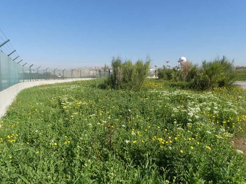 Espai marginal amb vegetació espontània i floració al costat de la tanca de l'aeroport.