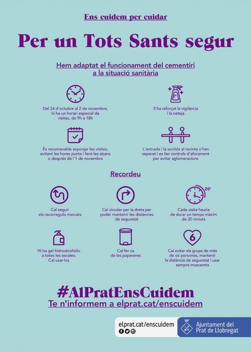 Els cementiris i l'Ajuntament del Prat recomanen que les visites comencin ja aquest proper cap de setmana (24 i 25 d'octubre) per tal que siguin el més espaiades possibles i així evitar les aglomeracions. En aquest sentit, es recomana visitar els cementiris els dies anteriors o posteriors a l’1 de novembre, així com evitar en la mesura que sigui possible les hores punta (d'11 a 14 h). Així mateix, es demana que les visites no superin els 20 minuts.