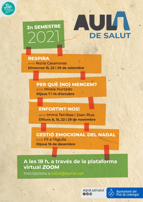 Amb l'embranzida de participació de l'Aula de Salut del primer semestre (150 inscripcions), es presenten les propostes de setembre-desembre 2021 aprofintant els aprenentatges fets, en quan a les temàtiques que han focalitzat l'interès, i també ampliant les sessions per aprofundir en els diversos àmbits.