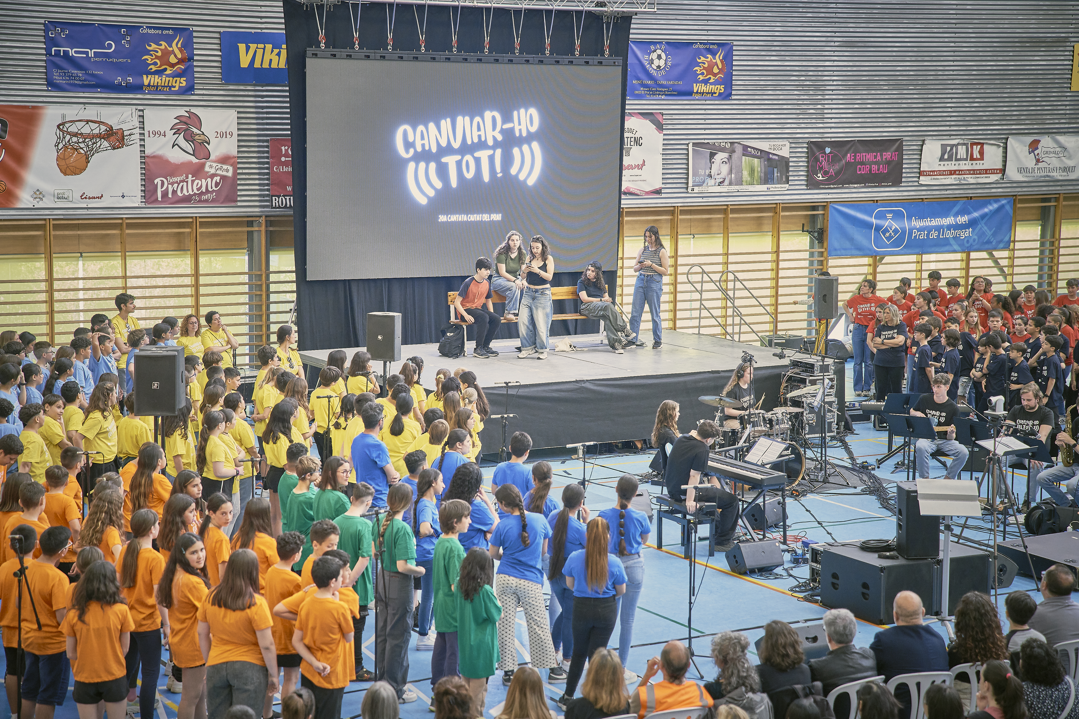 Tot seguit a les 10 h, arribava l’alumnat de les escoles Galileo Galilei, Bernat Metge, Can Rigol, Institut-escola del Prat, Sant Jaume, Ramon Llull, Escola del Parc i Josep Tarradellas per poder fer un assaig general abans que entressin les famílies, que van omplir el poliesportiu de gom a gom.