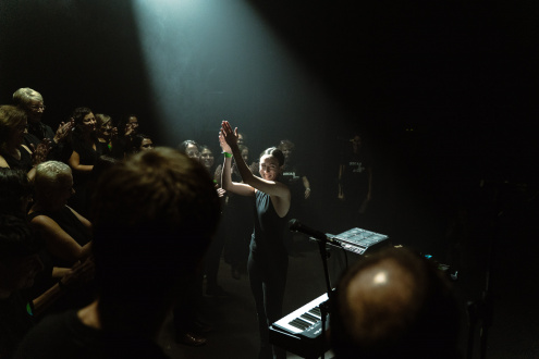 Tornem a la sala! Aquest cop el mood havia canviat: a l’escenari, la Claraguilar trepitjava amb delicadesa les tecles dels seus sintetitzadors. Les diferents veus i els beats, s'allongaven i s'enroscaven com les trajectòries d'algunes aus, suaus, ràpides i etèries. La seva barreja d'ambient i techno, no deixava de recordar a les composicions de post-rock quant a estructures reconeixibles, amb melodies memorables i passatges progressius. Cap al final de l’actuació, un cor de veus es va aparèixer d'entre el públic, i totes les persones que el conformaven – més de 30! – van pujar les escales, ocupant l’escenari i rodejant la Claraguilar, formant una sola veu amb ella. El Cor d'Adults de L'Escola d'Arts en Viu va mostrar del que era capaç en tan sols 3 assajos i, sota la batuta de la Carla Azanuy, ens va fer emocionar a tots plegats.