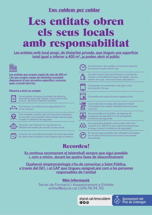 Si sou una entitat i teniu dubtes sobre l'obertura del local o com portar a terme algunes activitats, ho podeu consultar a través del Servei de Formació i Assessorament a Entitats, entitats@elprat.cat o tel. 696 909 470.