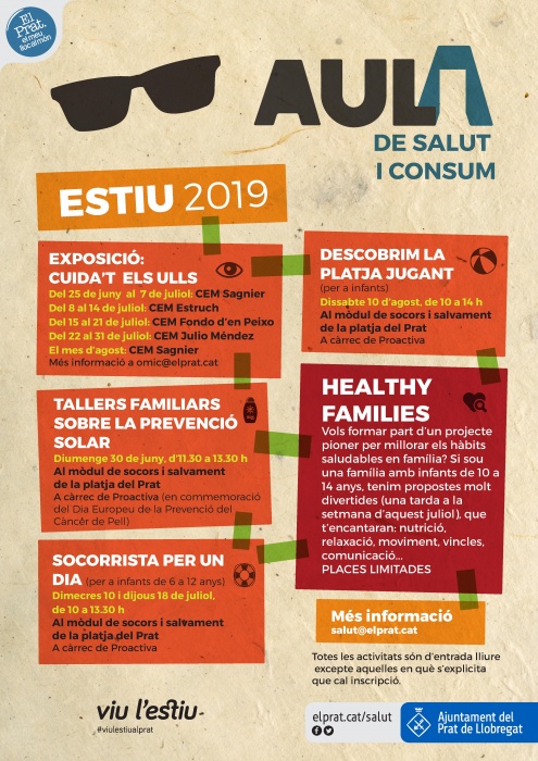 Enguany es durà a terme el projecte pioner Healthy families, per a totes aquelles famílies amb infants de 10 a 14 anys que vulguin participar una tarda a la setmana del mes de juliol de diferents propostes lúdiques i divertides per millorar els hàbits saludables (nutrició, relaxació, moviment, vincles, comunicació...). Serà una oportunitat de compartir temps de qualitat amb les criatures mentre fem salut. La proposta és gratuïta i si voleu més informació només us heu d’adreçar a salut@elprat.cat (places limitades).