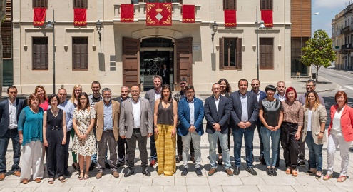 Foto de grup dels nous regidors i regidores, a la plaça de la Vila, davant de l'Ajuntament.