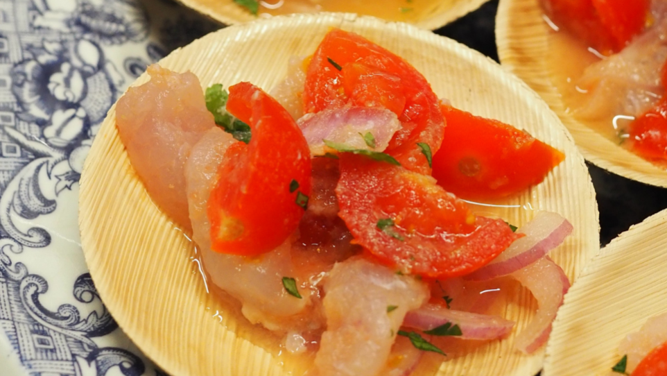 Per no quedar-nos només amb la teoria, li vam demanar a l'Anna Bozanno que, abans de la xerrada, ocupés la cuina per preparar un petit tastet gastronòmic de proximitat. I aquí és quan vam poder comprovar que les opcions sostenibles poden ser un èxit. Gamba panxuda arrebossada i una versió del cebiche amb sarg pescat artesanalment a Arenys de Mar.