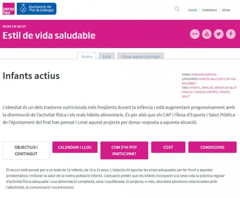 Atès l’interès que ha despertat el projecte Infants actius, contra el sobrepès i l’obesitat infantil al Prat, el web municipal ha obert un espai al qual es pot accedir des d’elprat.cat/salut o des d'elprat.cat/esports per tal que tothom que tingui interès pugui fer seguiment del projecte. Aquest espai virtual té l’objectiu de recollir i socialitzar els continguts i aprenentatges realitzats.