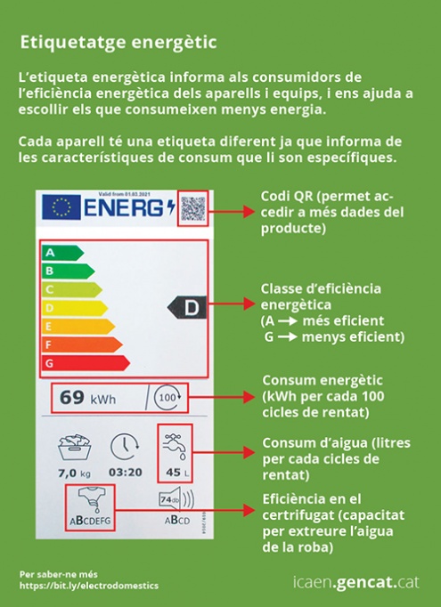 Des de l’1 de març de 2021 els electrodomèstics que es troben a la venda han d’incorporar una nova etiqueta d’eficiència energètica. A la nova etiqueta desapareixen les categories A+, A++ i A+++. Ara l’escala va des de l’A, en verd fosc, que indica que el producte és molt eficient, fins a la G, en vermell i que correspon a una eficiència baixa. La normativa europea que regula l’etiquetatge d’eficiència energètica també amplia el termini durant el qual els fabricants han de disposar de peces de recanvi. Es pot ampliar informació a: