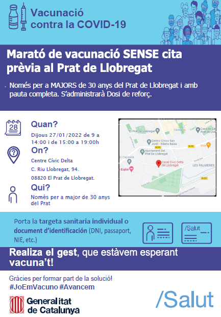 El proper dijous 27 de gener, de 9 a 14 hores i de 15 a 19 hores, el Servei Català de la Salut de la Generalitat organitza al centre cívic Delta (carrer del Riu Llobregat, 94) una nova marató de vacunació contra la covid sense cita prèvia.