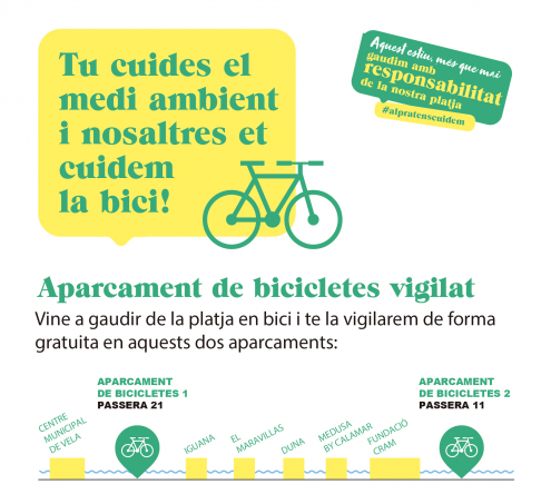 A partir de dijous 25 de juny entraran en servei a la platja dos aparcaments vigilats gratuïts per a bicicletes, patinets i altres vehicles de mobilitat personal (VMP). L'objectiu d'aquesta iniciativa de l'Ajuntament del Prat és fomentar el desplaçament per mitjans sostenibles a la platja, en detriment dels vehicles de motor. Cal recordar que aquest estiu, per motius sanitaris, s'ha reduit el nombre de places d'aparcament de cotxes a la platja per controlar millor l'aforament i evitar aglomeracions.