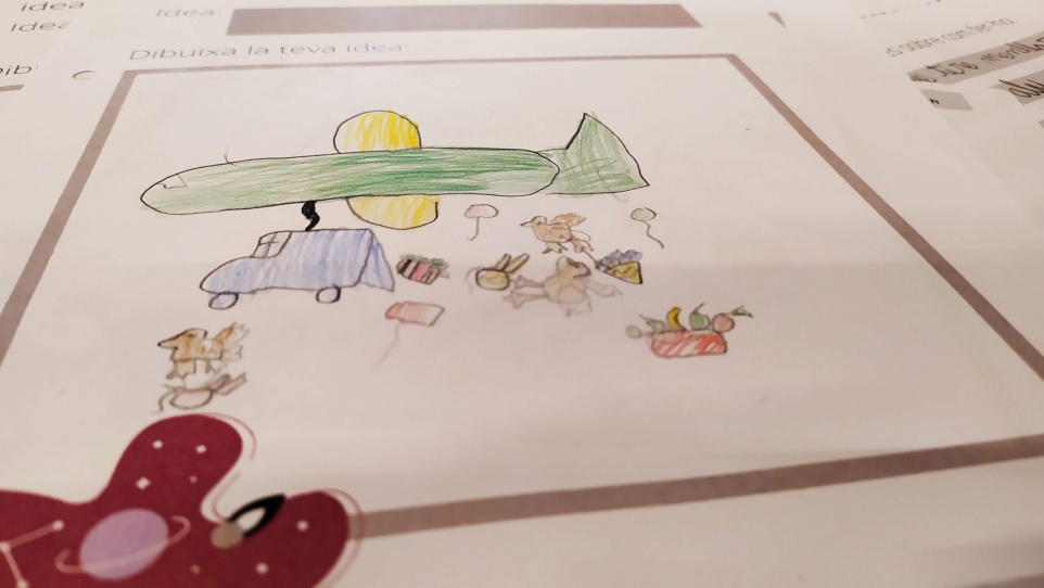 - Un avió que reparteix menjar per a totes les persones que no en tenen amb diferents mecanismes: coloms missatgers, camions que surten de l'avió, globus i paracaigudes.