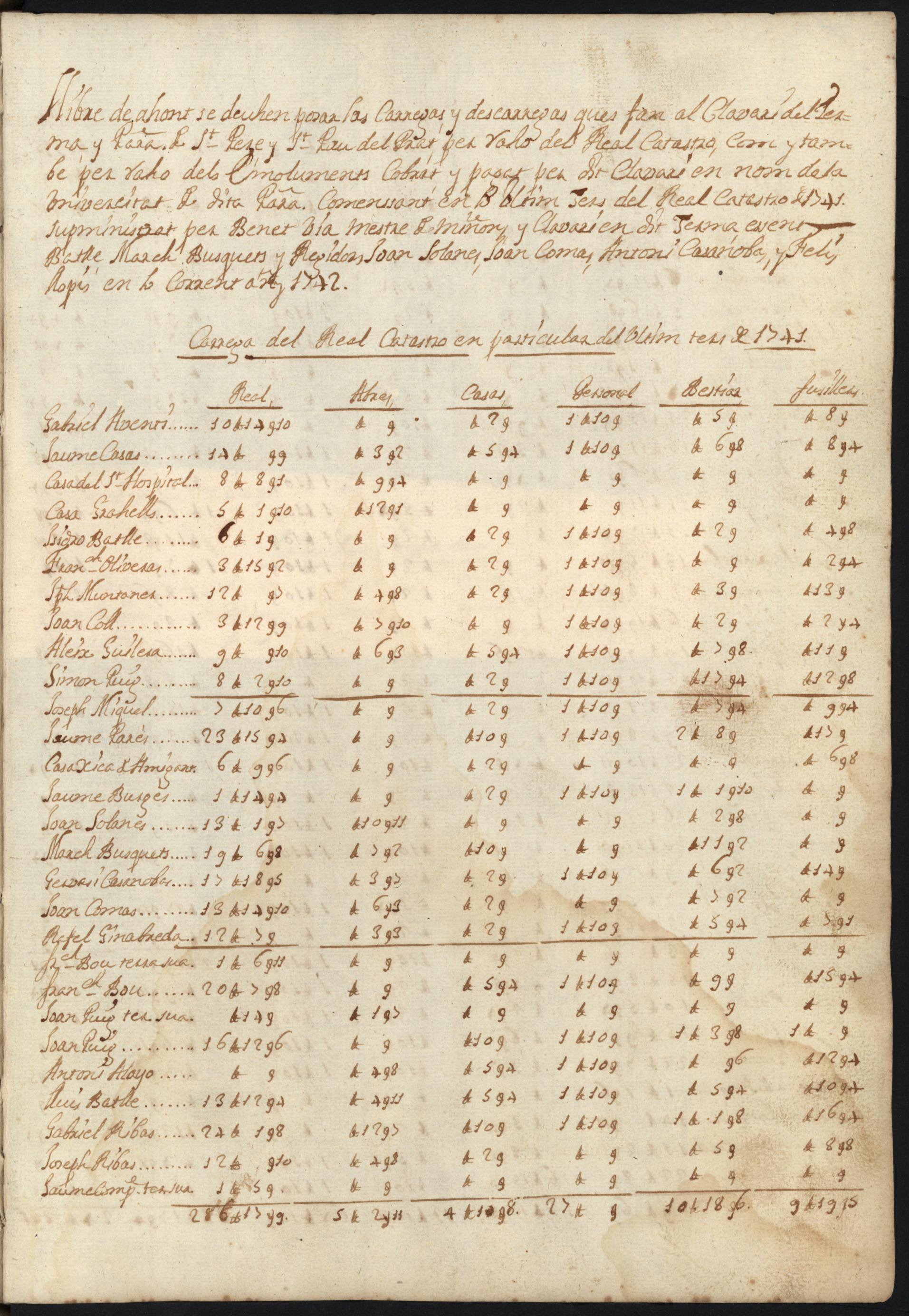 El document, escrit en català, que us presentem aquest mes, forma part del Cadastre de 1742 i pertany al Fons Jaume Codina, instal·lat a l'arxiu municipal del Prat.