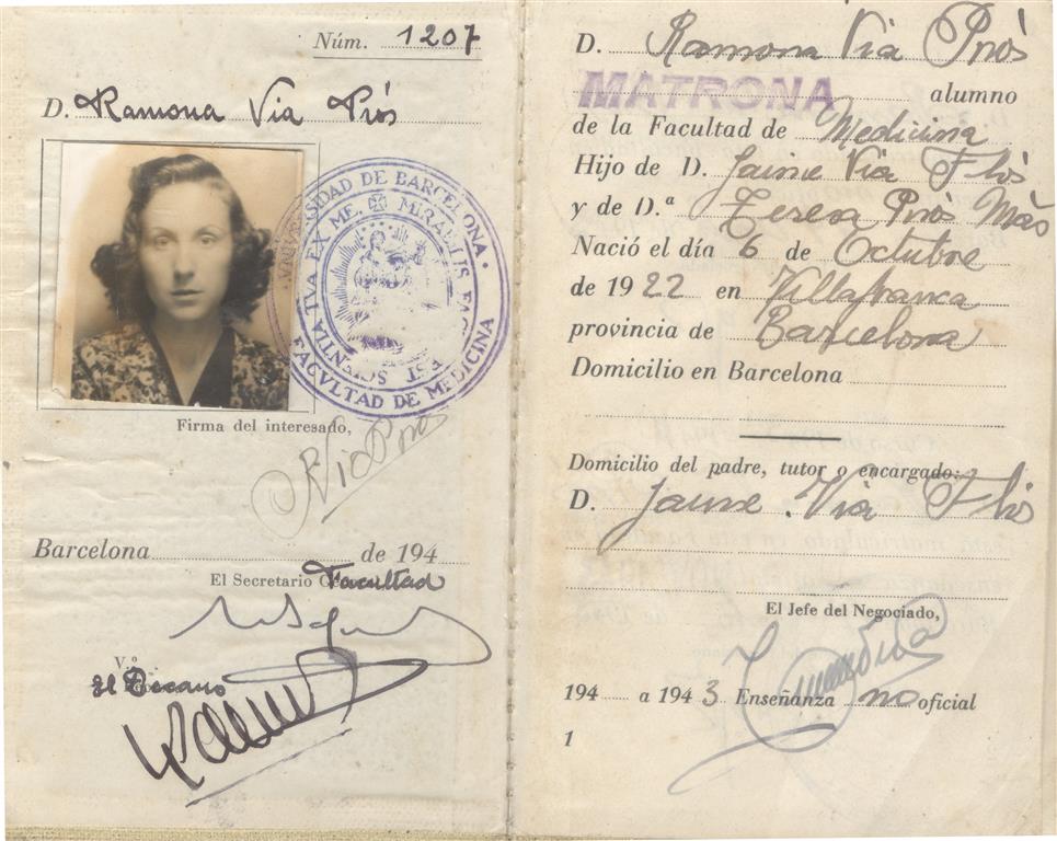 El document d’aquest mes fa referència al carnet d’estudiant de la Ramona Via a la Facultat de Medicina. Es tracta d’un document de 1943 que forma part del Fons documental i Bibliogràfic de Ramona Via. El fons va ingressar a l’Arxiu municipal del Prat, mitjançant conveni de donació, el 19 de desembre de 2018. El fons conté un important fons bibliogràfic, amb més de 800 llibres, i documentació relacionada amb la seva vida i trajectòria. Actualment, el fons es troba en procés de classificació i catalogació.