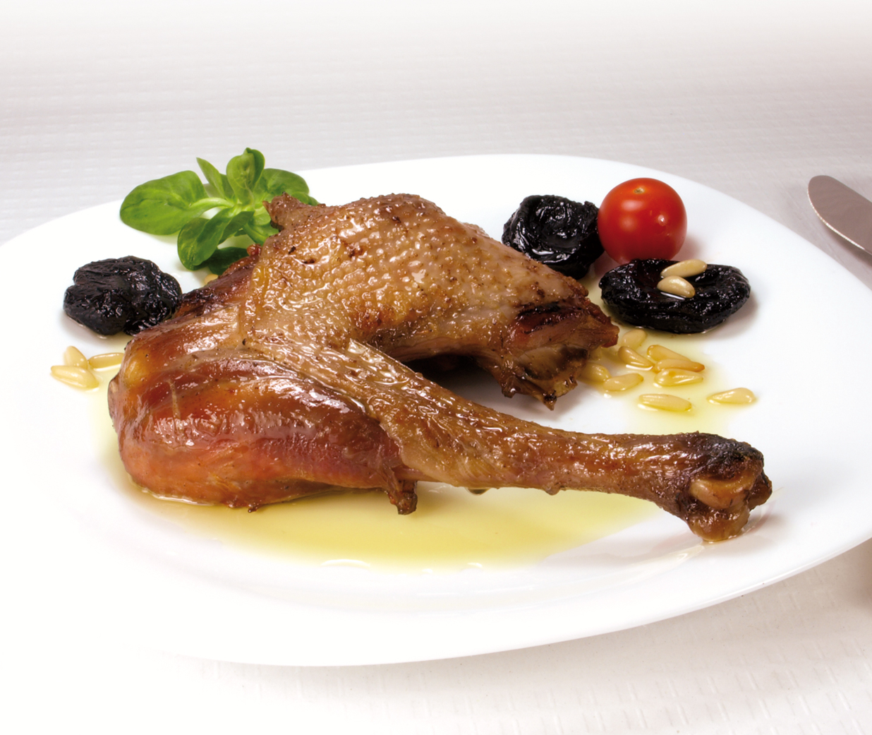 - Cuixa de Pota Blava cuinada 10 hores, suc de rostit, poma i prunes (supl. 5 €)