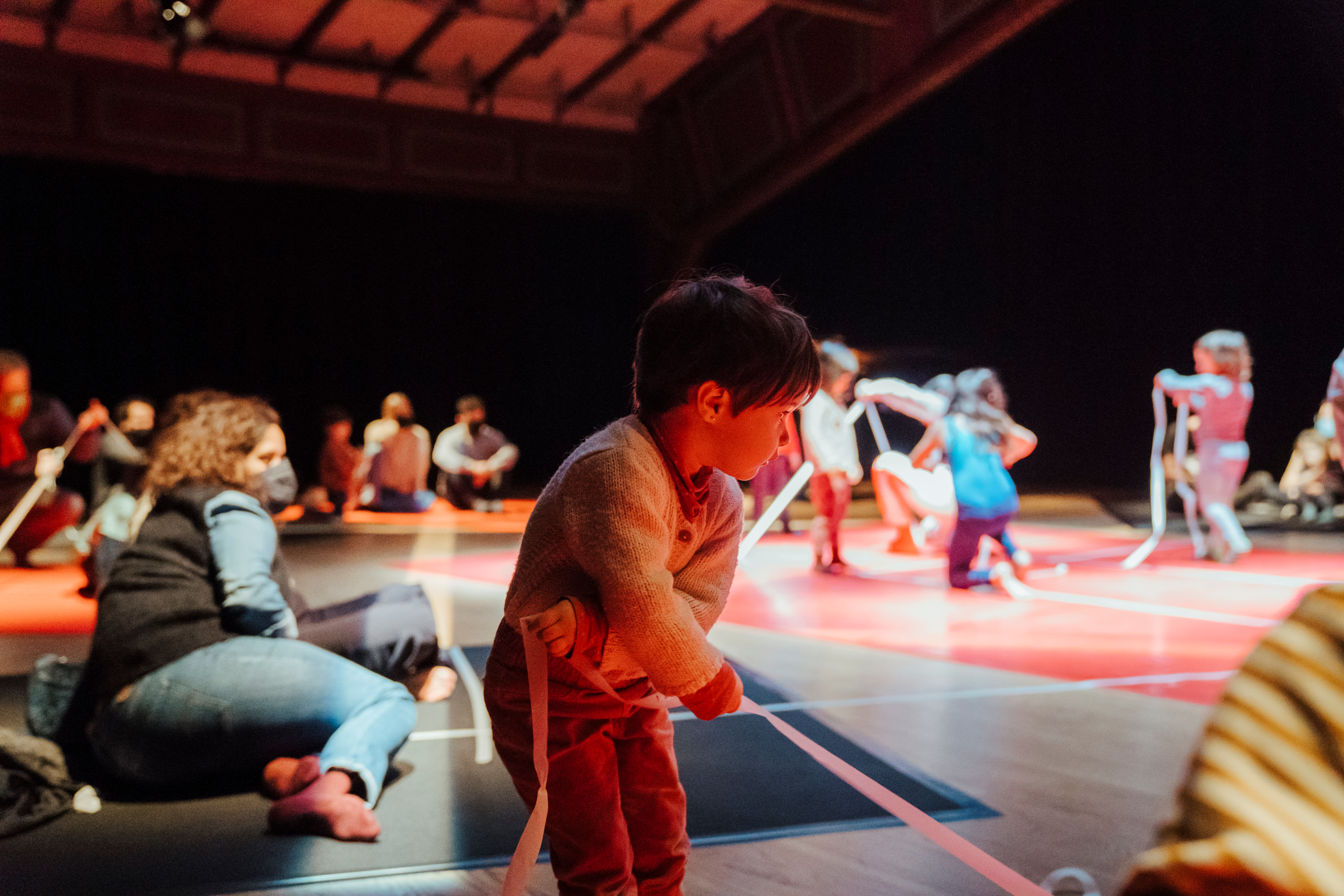 Dues ballarines i un pianista, dibuixen amb el cos i la música paisatges abstractes, juganers, íntims, suggeridors…. Un element senzill, la cinta de pintor, genera moments d’enorme bellesa quan es troba amb l’univers infinit del nadó, meravellat per la novetat i convidat per les intèrprets a l’exploració i el joc.