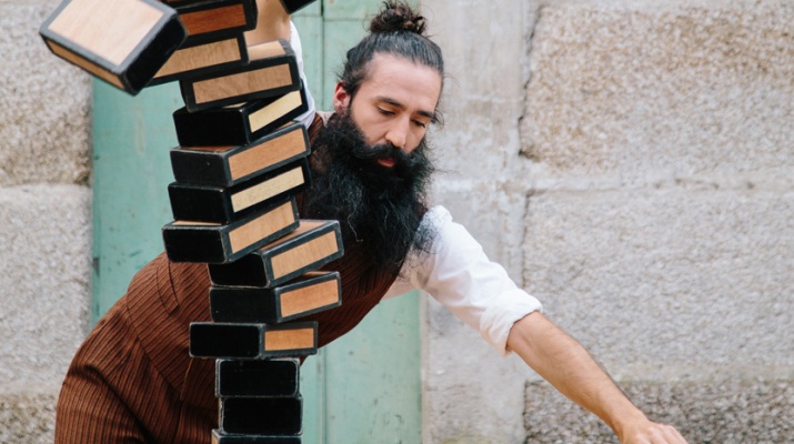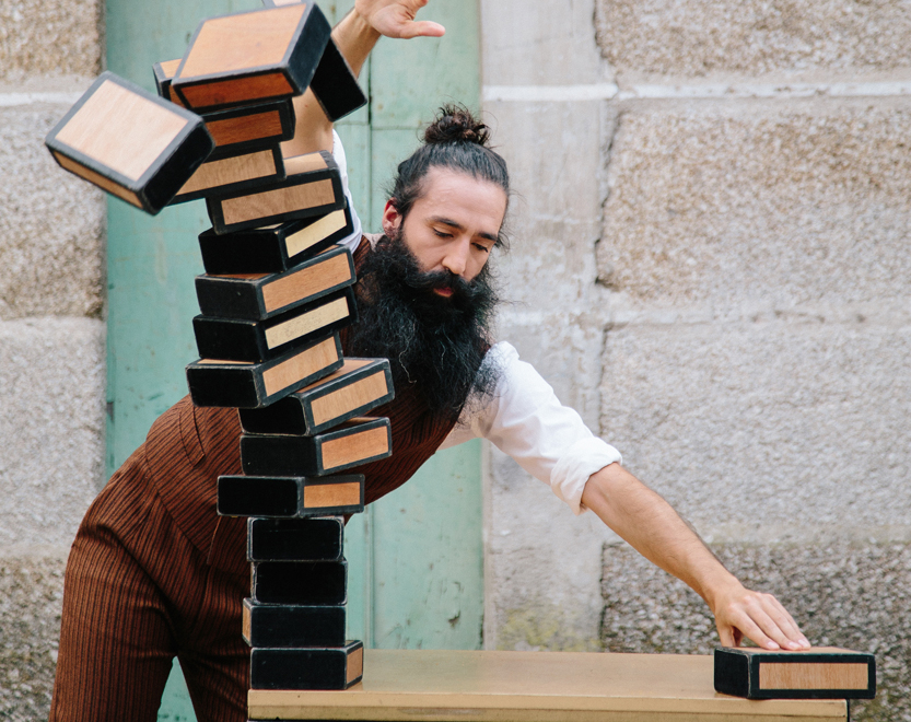 El malabarista gallec Jesús Velasco presenta una peça que és fruit de la recerca en una tècnica no massa estesa i menys com a punt de partida de tot un espectacle: els “cigar boxes” o malabars amb caixes.