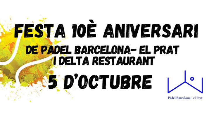 Esteu aquíInici » Agenda d'activitats » Festa 10é aniversari Padel Barcelona-el Prat i Delta Restaurant Festa 10é aniversari Padel Barcelona-el Prat i Delta Restaurant Temes: EsportsTIPUS: Acte esportiuPer a qui: Adult Festa celebració 10 anys del Pael Barcelona- El Prat