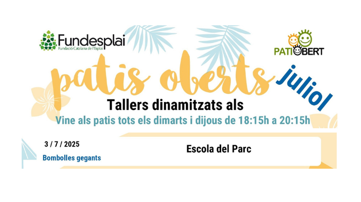 Esteu aquíInici » Agenda d'activitats » TALLER DINAMITZAT PATI OBERT: Bombolles gegants TALLER DINAMITZAT PATI OBERT: Bombolles gegants Temes: Educació, EstiuTIPUS: JocsCicles: Tallers dinamitzats Pati ObertPer a qui: Familiar, Infantil