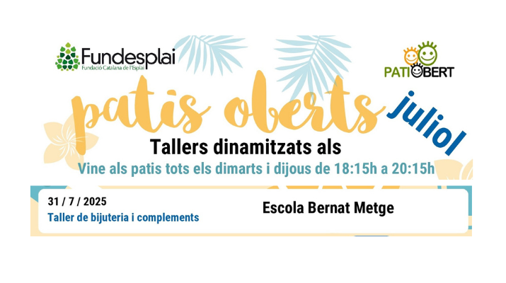 Esteu aquíInici » Agenda d'activitats » TALLER DINAMITZAT PATI OBERT: Taller de bijuteria i complements TALLER DINAMITZAT PATI OBERT: Taller de bijuteria i complements Temes: Educació, EstiuTIPUS: JocsCicles: Tallers dinamitzats Pati ObertPer a qui: Familiar, Infantil