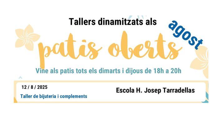 Esteu aquíInici » Agenda d'activitats » TALLER DINAMITZAT PATI OBERT: Taller de bijuteria i complements TALLER DINAMITZAT PATI OBERT: Taller de bijuteria i complements Temes: Educació, EstiuTIPUS: JocsCicles: Tallers dinamitzats Pati ObertPer a qui: Familiar, Infantil