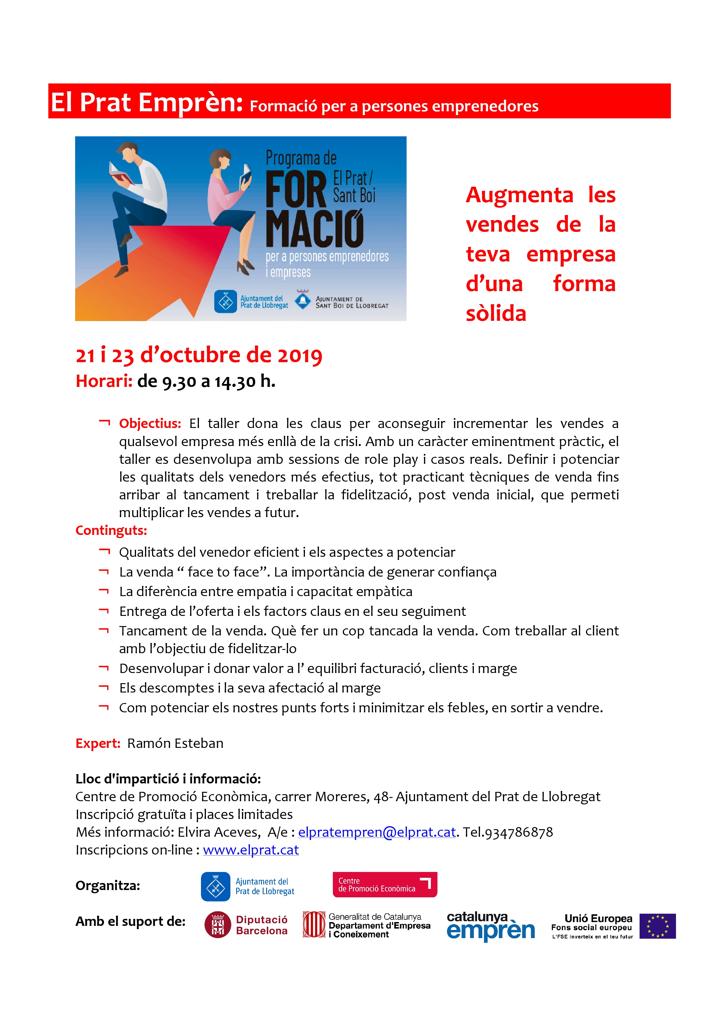 El taller dona les claus per aconseguir incrementar les vendes a qualsevol empresa més enllà de la crisi. Amb un caràcter eminentment pràctic, el taller es desenvolupa amb sessions de role play i casos reals.