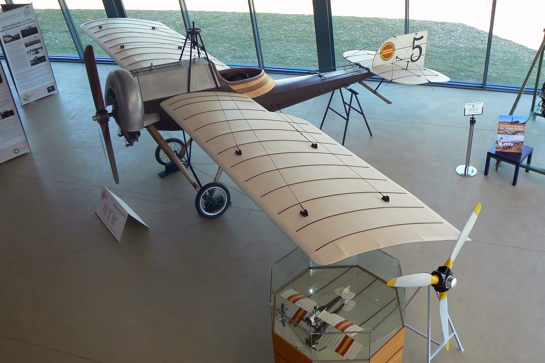 S'hi troben rèpliques del primer avió que es va enlairar des de l’aeroport del Prat i del que va fer el primer vol a Espanya, a Barcelona, fa un segle